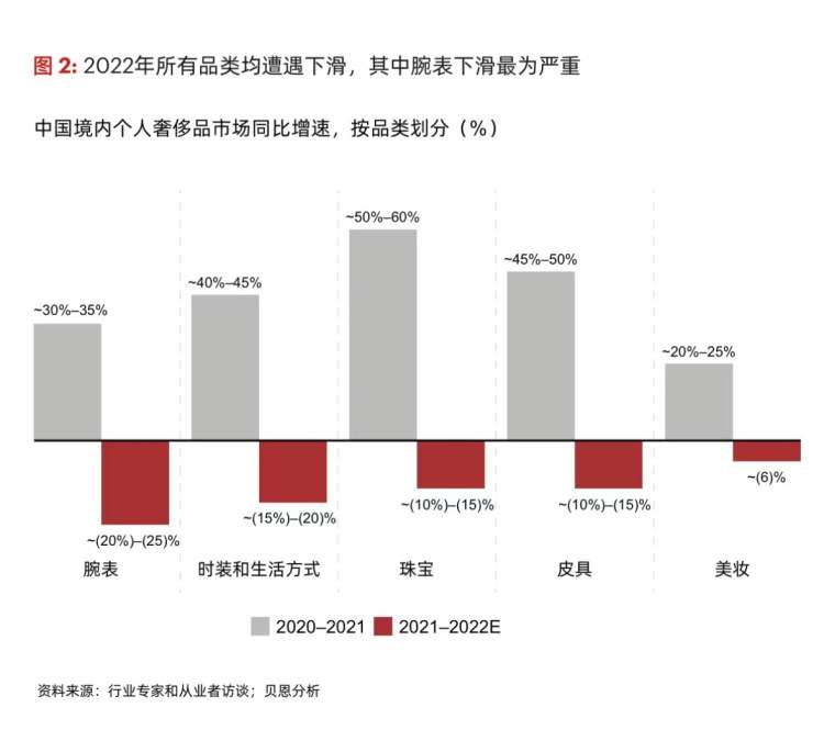 其中,线上渠道渗透率较高的品类受到疫情的影响较弱,例如奢侈美妆品类,由于渗透率达到50%,因此仅缩水了6%左右。与之形成对比的是腕表市场,相较于2021年缩水了20%-25%。