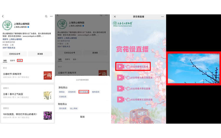 辰山植物园工作人员采用慢直播的方式,精选角度与机位,将摄像头对准一枝选中的河津樱枝条进行24小时直播记录,实时播放河津樱的开花过程。市民可以登录辰山植物园官方微信号的“赏花慢直播”服务板块,通过“云赏花”慢直播,实时看到河津樱绽放的最新花情与动态,预测开花时间,接下来,辰山植物园还将开展花期竞猜活动。