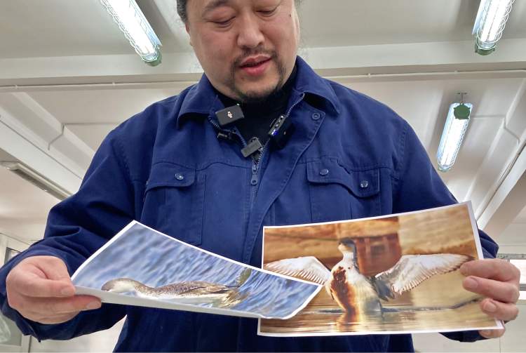 前几天,我们已经对它进行了一些前期处理。我们的团队为了本次黑喉潜鸟标本制作做了详细的准备工作,查询大量图片,从专业角度了解它的身体体征,最终选定了它在湖面展翅站立的姿态制作标本。”