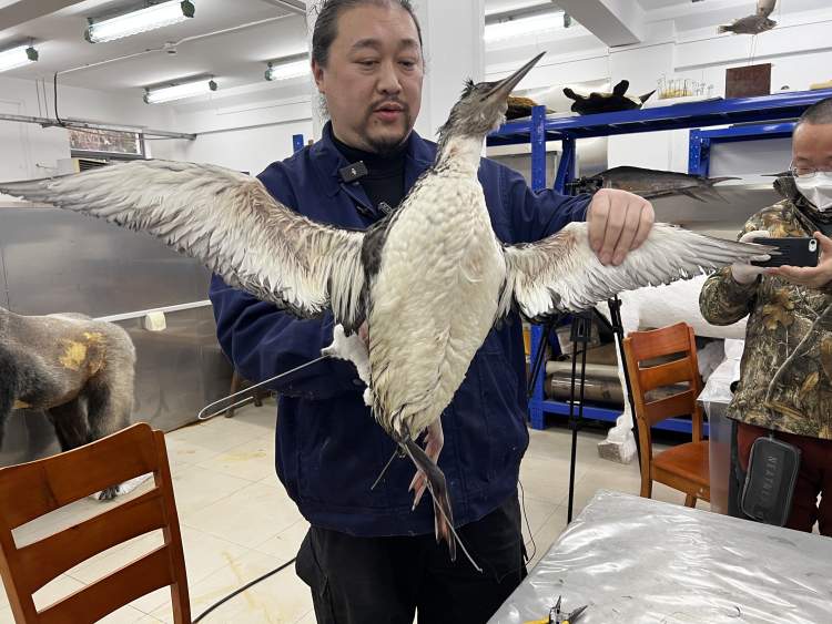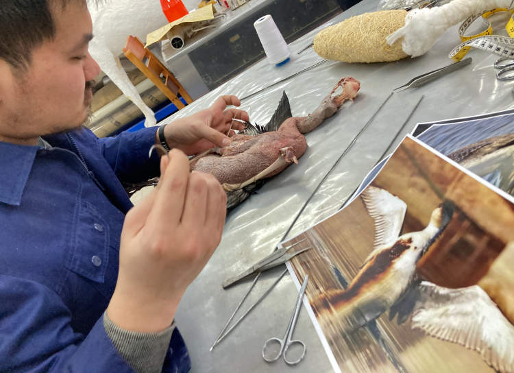 以铁丝做“骨”,用脱脂棉花为“肉”,还原其骨骼肌肉的形态;在头骨里塞入竹丝,再以陶土塑型……在标本师的细心操作下,眼前这只黑喉潜鸟慢慢地展开了双翅,重现“生机”。