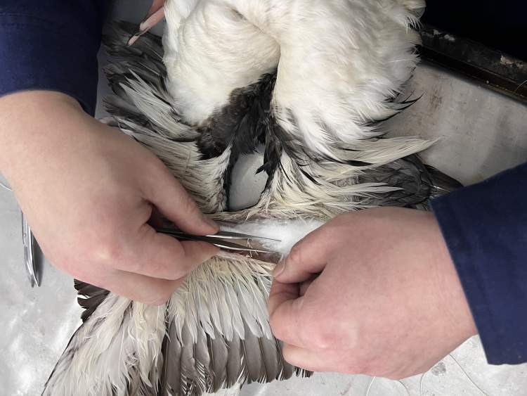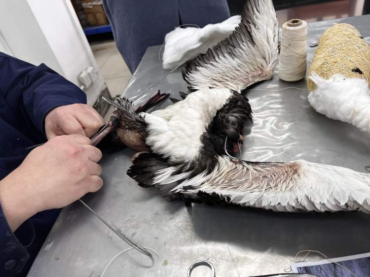 标本师用蜡线和缝合针对黑喉潜鸟破损处进行修补的工作细致得犹如一台外科缝合手术。