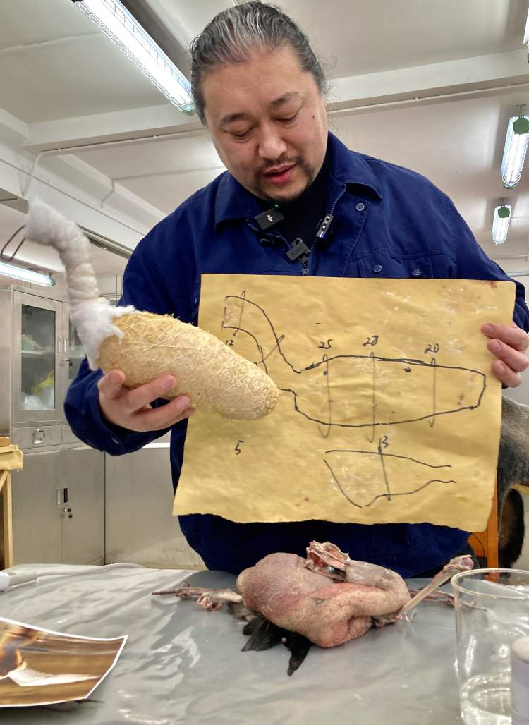 在记者们围观之前,标本师们已经对它进行了解剖去内脏和清洗的过程。在这些步骤中,要尽量保持鸟的外形完整。