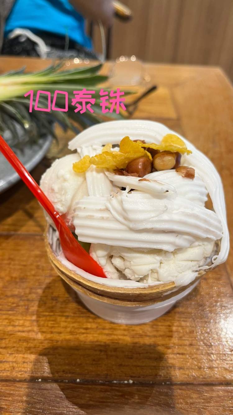 在商场的美食广场吃饭需要先买一张储值卡,然后再用卡来买吃的,价格方面还算实惠,比如一份菠萝炒饭200泰铢;一份椰子冰淇淋100泰铢;烤生蚝25泰铢一个↓