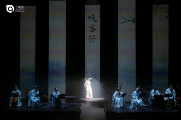 《山岚乐坊—月影》整场演出选取“月影白”这一特定传统色作为创意来源,构建了《侠客行》《海派缘》《国风情》三个篇章,改编演绎了十余首与主题相契合的曲目,并融入舞蹈、戏曲等多种艺术形式,营造出能从“月影白”通感联想的特定意境氛围。