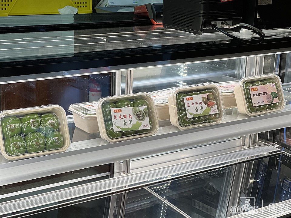 在新雅粤菜馆,记者看到售价10元/只的川香牛肉青团是今年推出的新品种,据店员介绍,口感可能略带一点点辣味。而新雅粤菜馆在海报上力推的腌笃鲜青团,为这家老字号多年前独家首创,对一些上海市民仍有一定的吸引力,记者在现场购买了一盒腌笃鲜青团。
