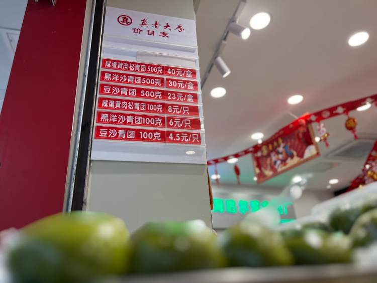 价格方面,杏花楼、新雅、泰康等几家老字号的豆沙青团价格略有上调,但整体涨幅不大,如泰康一盒豆沙青团仅上涨了1元;真老大房豆沙青团价格仍然维持不变,而黑洋酥青团单只价格上调1元,杏花楼现制现售的咸蛋黄肉松(一盒6只)从去年的52元调整为55元。