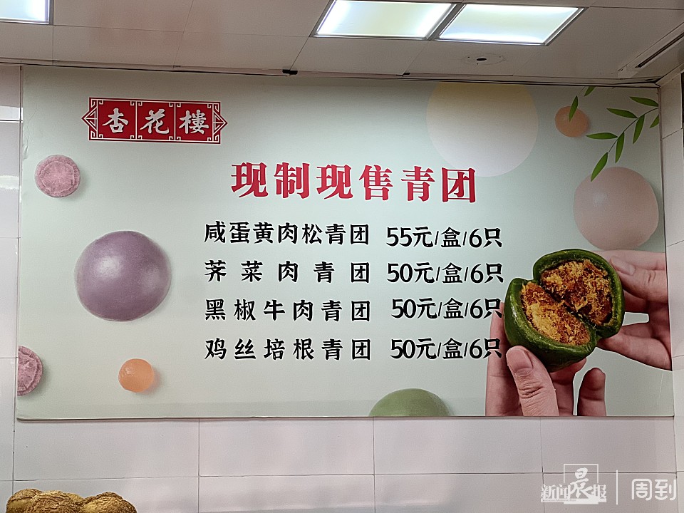 杏花楼在2月3日(正月十三)就早早官宣了今年青团即将上市的消息。2月6日(正月十六)起,杏花楼的门店就已开启青团销售。在福州路杏花楼总店,记者透过橱窗玻璃,看到点心师傅们正在制作青团。而咸蛋黄肉松、荠菜鲜肉、鸡丝培根等四种口味的现制现售青团已摆上柜面开始销售。据收银员介绍,现制现售青团建议当天食用为适宜。