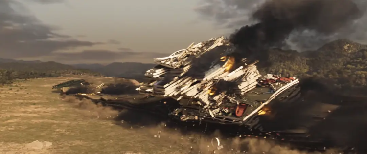 而为了呈现船被切开之后的状态,团队又花了很长时间做船的钢体碰撞、扭曲效果模拟。导演杨磊曾透露,剧组曾经花了四个多月的时间搭建了切割后的残骸,“残骸是很难搭建的——一个船体被切割成了很多片后又被挤压,形成了一个不规则,甚至是毫无道理的残骸外形。我们于是用实体钢先做出一艘船的样子,然后把它横切,之后再挤压,最后把这些残片再一个个焊接在一起。”