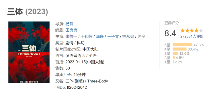 值得一提的是,目前《三体》在海外的播出也大受好评。公开数据显示,剧版《三体》在Youtube平台观看人数超400万,腾讯视频海外版WeTV北美地区日均站内播放量高居TOP1,IMDb评分连续19集突破9.0,其中单集最高评分达9.9。