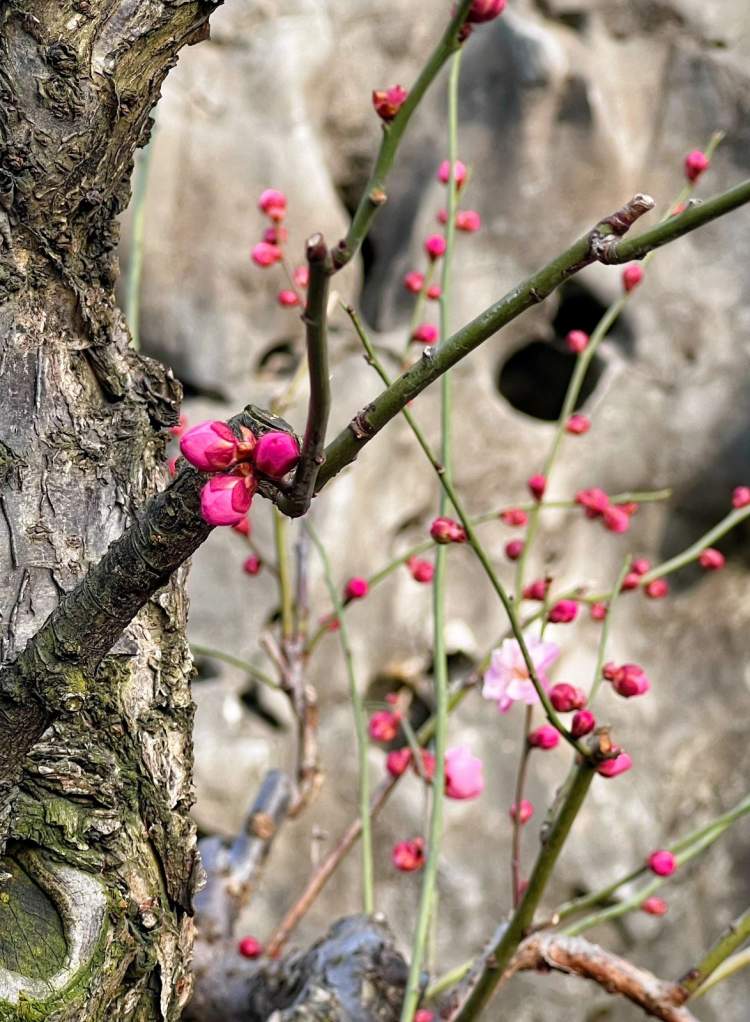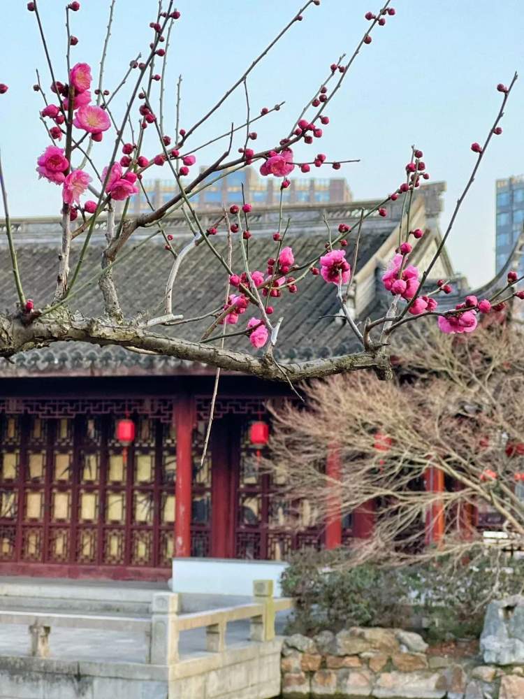 立春过后,古猗园的梅树枝头结满圆鼓鼓的花苞,有的已经冲寒绽开,红梅艳如朝霞,白梅优雅纯净,每一朵都传递着春天的气息。