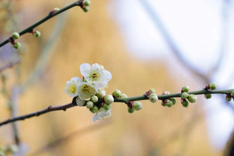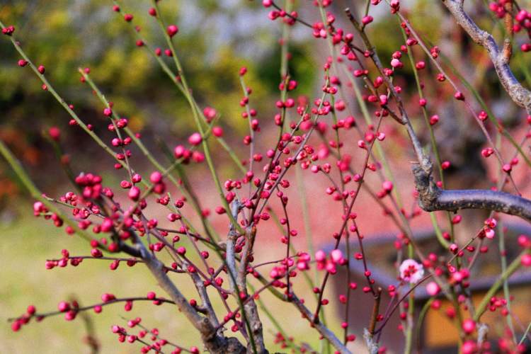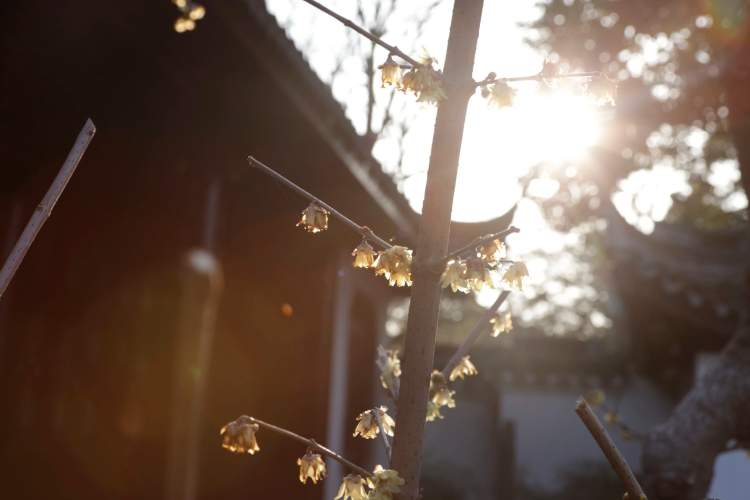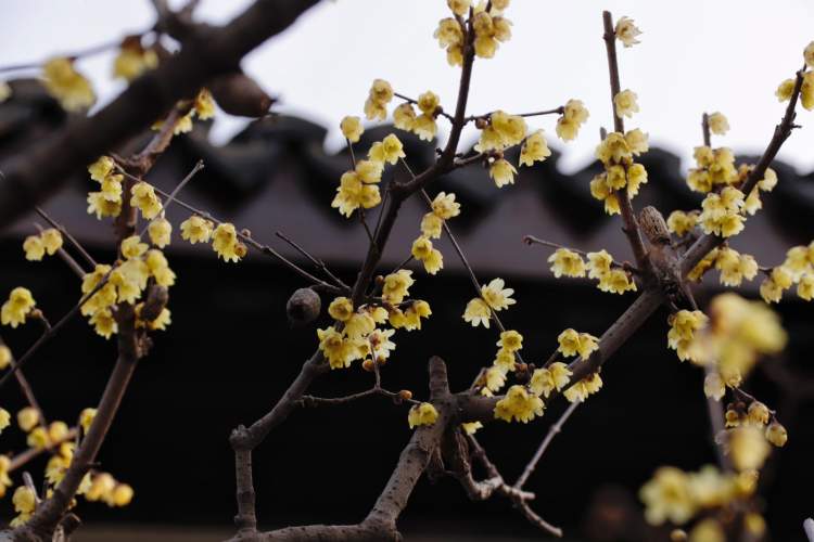 初开的梅花半开半露,更多的还是密匝匝的花苞,圆圆鼓鼓,点缀在虬枝上,娇嫩如滴,与飞檐斗拱、亭台楼阁相映衬。