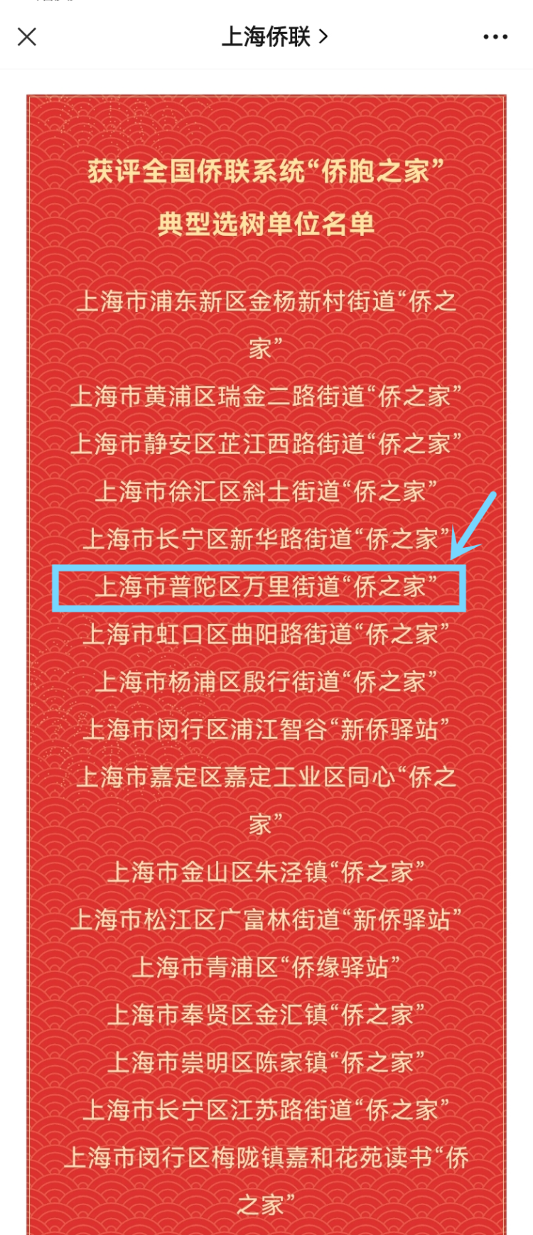 多年来,在区委统战部的精心指导下,万里街道党工委始终坚持以习近平新时代中国特色社会主义思想为指引,准确把握、深刻领会新时代统战工作新定位、新重点和新要求。万里街道侨联荣获“2021年上海市统一战线(工作)先进集体”,街道“侨之家”先后获得上海市“四星级侨之家”、“五星级侨之家”、“上海市侨联系统先进集体”等荣誉。