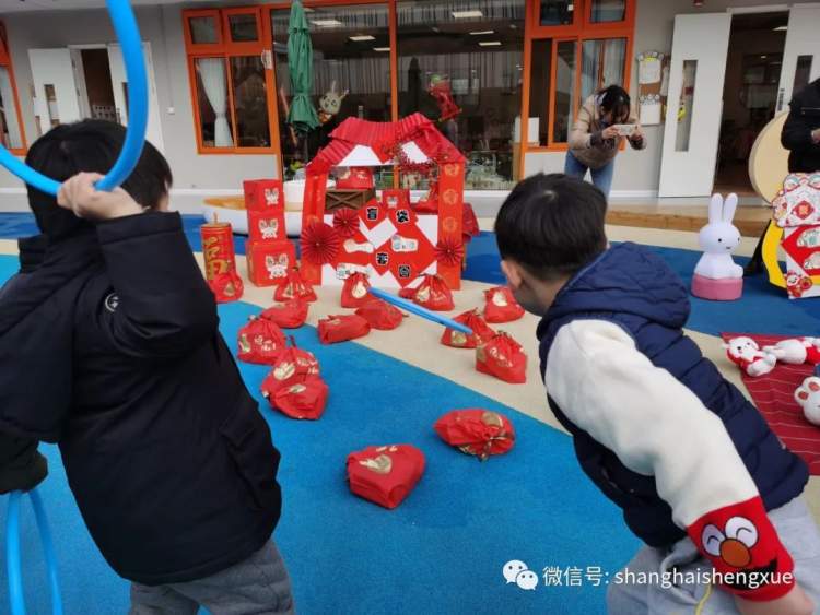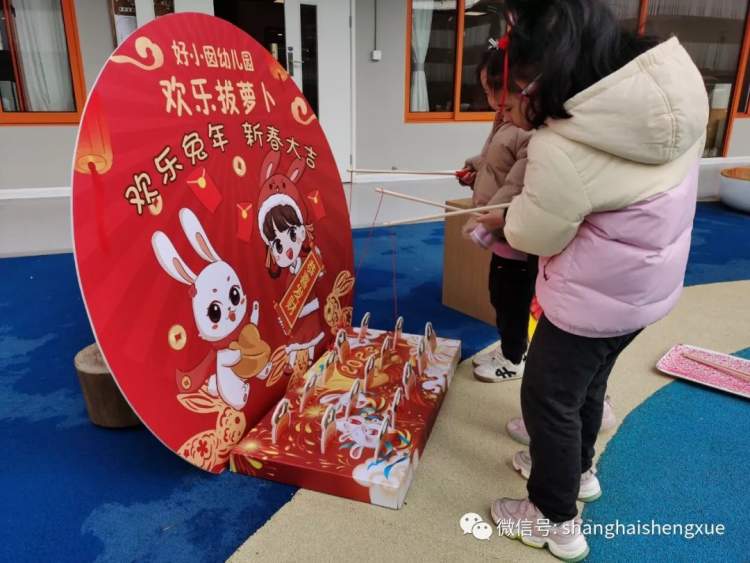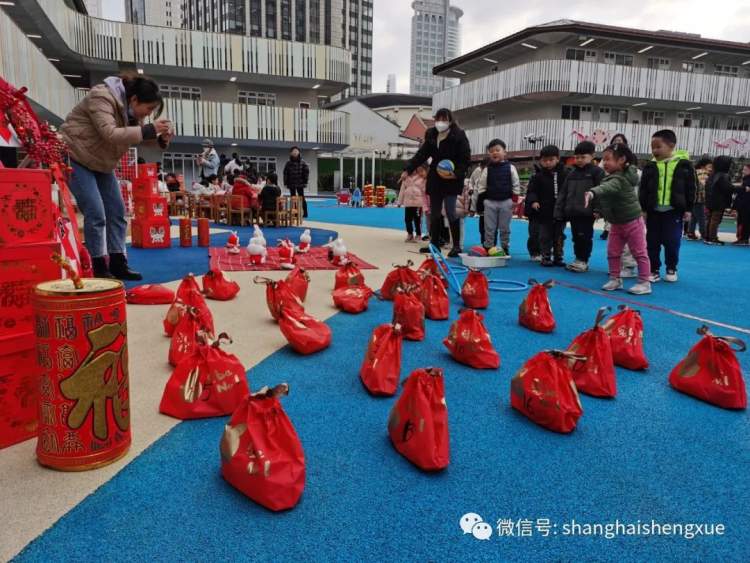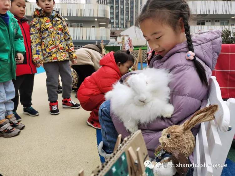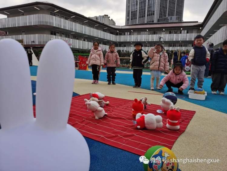 今天9点半刚过,孩子们就从教室来到操场。老师们已经布置好了多个游戏区域,有“翻滚吧,兔子”、“盲袋套圈”、“翻山越岭”、“欢乐拔萝卜”、“手忙脚乱”等。还有一位小朋友,抱来了家里的“萌宠”——一只长毛兔,让小伙伴们抱一抱,摸一摸,把兔年的氛围拉到满格。