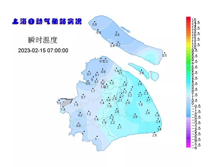由于叠加辐射降温效应,徐家汇站最低只有2.5℃,部分郊区已跌到冰点以下。