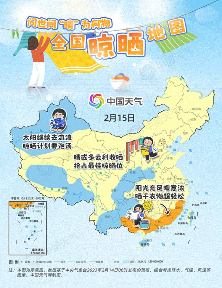 今天,中国天气网推出的全国晾晒地图,可以看到中东部迎来2月以来晴天范围最大的一天。