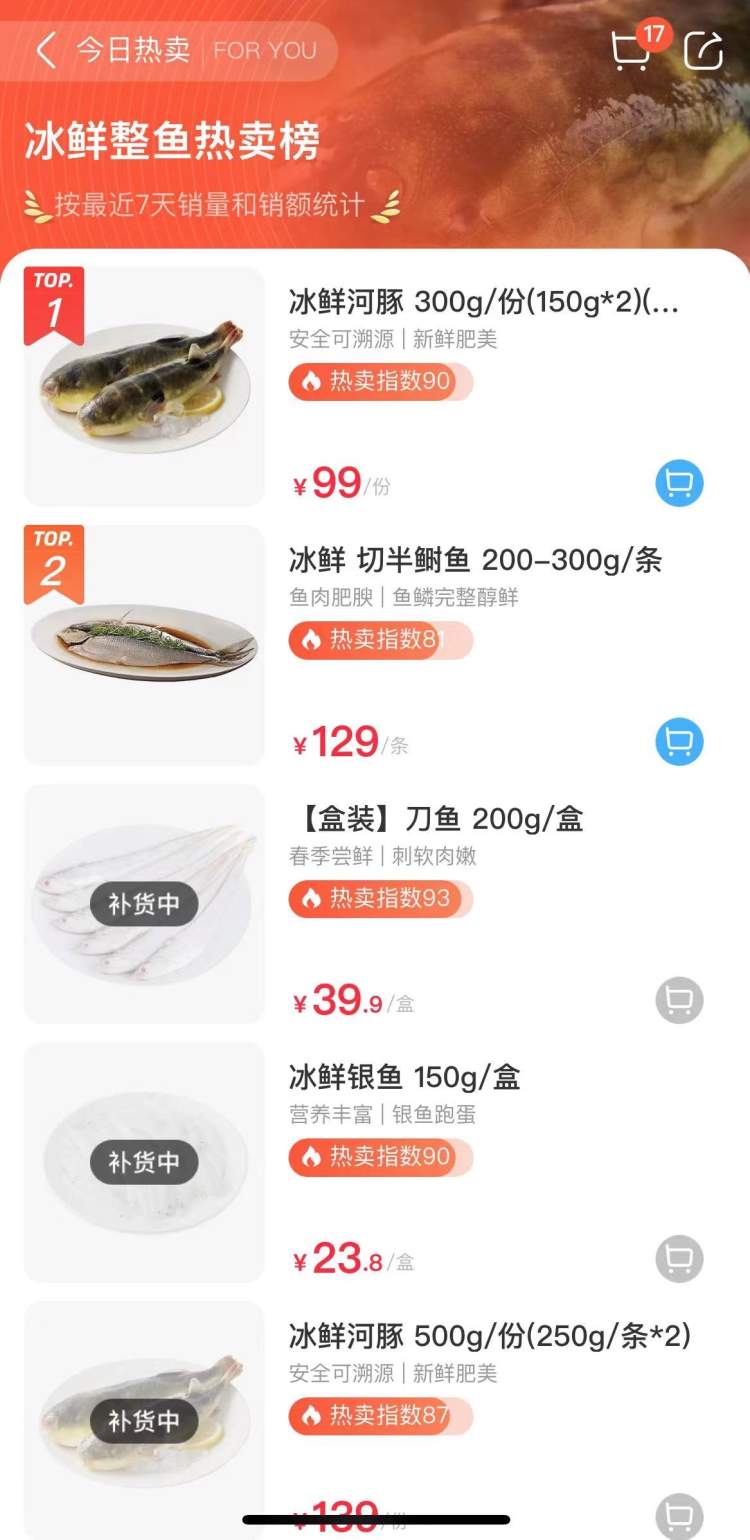 在这份榜单上,记者看到,冰鲜河豚一份300克,有2条鱼,每条150克左右,也就是一两半,售价是99元,换算一下,一斤是165元,并不便宜。榜单第二位和第三位是鲥鱼、刀鱼,切半鲥鱼是129元一条,一条200-300克,刀鱼一盒200克卖39.9元。