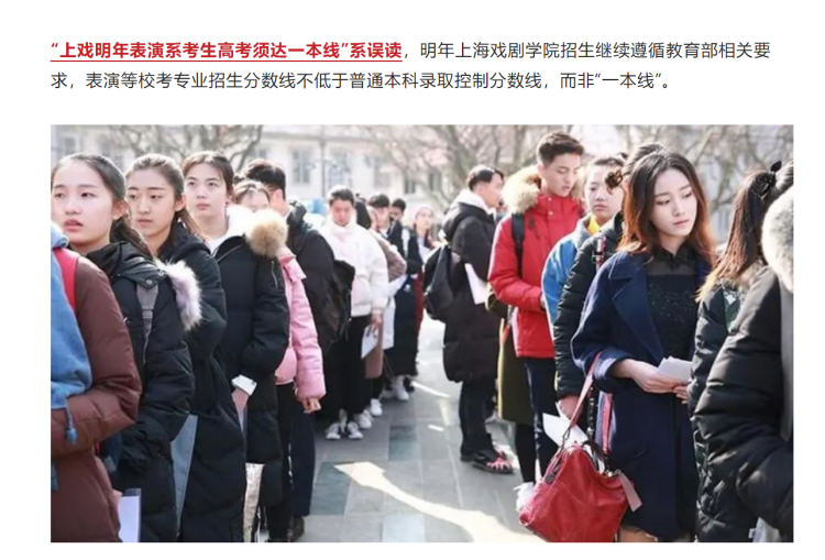2月19日,#上戏明年表演系考生高考须达一本线# 冲上热搜第一,不少网友表示欢迎,希望艺术类考试逐步提高门槛,培养更多德艺双馨的演员。但据上观新闻报道,上海戏剧学院方面随后回应,“上戏明年表演系考生高考须达一本线系误读”,明年上海戏剧学院招生继续遵循教育部相关要求,表演等校考专业招生分数线为普通本科录取控制分数线,而非一本线。