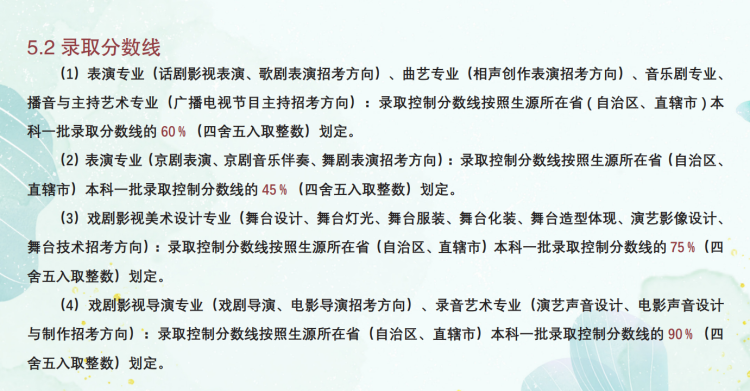 记者随后还查询了中央戏剧学院、北京电影学院等院校对表演系的文化课分数要求,其中《中央戏剧学院2023年本科招生专业考试简章》显示,表演专业(话剧影视表演、歌剧表演招考方向)等录取控制分数线将按照生源所在省 ( 自治区、直辖市 ) 本科一批录取分数线的 60%(四舍五入取整数)划定。