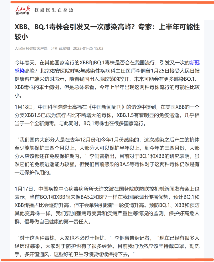 人民日报健康客户端2023年1月25日报道《XBB、BQ.1毒株会引发又一次感染高峰?专家:上半年可能性较小》