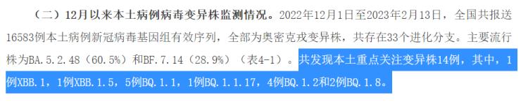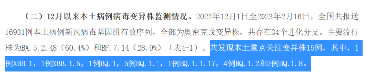 文中通报了12月以来本土病例病毒变异株的监测情况:2022年12月1日至2023年2月16日,全国共报送16931例本土病例新冠病毒基因组有效序列,全部为奥密克戎变异株,共存在34个进化分支。主要流行株为BA.5.2.48(60.4%)和BF.7.14(28.9%)。共发现本土重点关注变异株15例,其中,1例XBB.1,1例XBB.1.5,1例BQ.1,5例BQ.1.1,1例BQ.1.1.17,4例BQ.1.2和2例BQ.1.8。