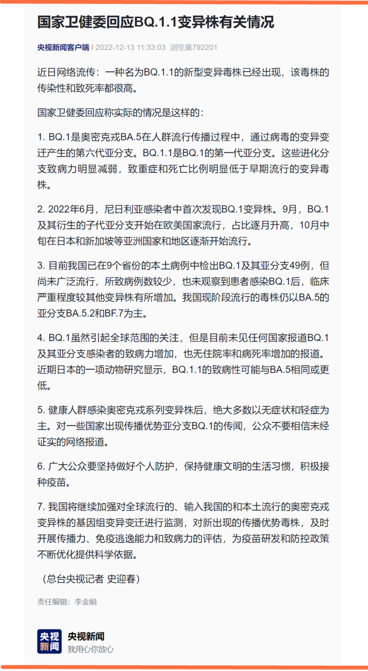 央视新闻客户端2022年12月13日报道《国家卫健委回应BQ.1.1变异株有关情况》