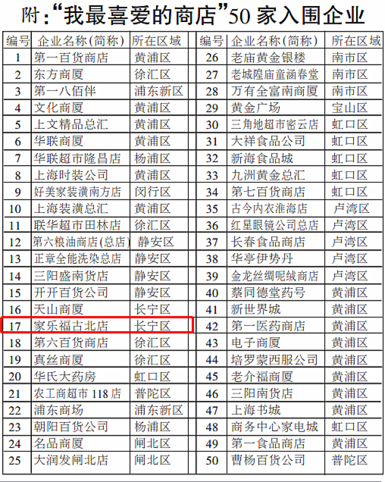 1999年10月,家乐福古北店进入上海市民“我最喜爱的商店”50家入围企业评选名单