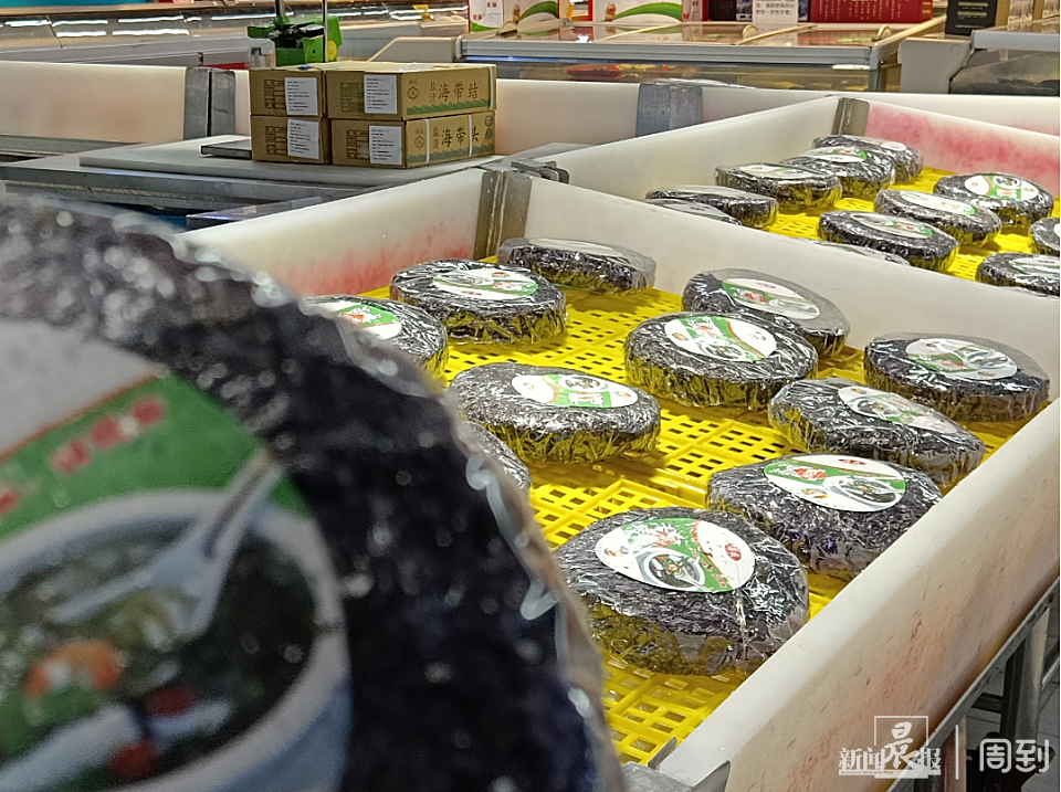 海鲜柜台的东西有点“牵强附会”,新鲜的河鲜和冰冻海鲜不见了,包装好的干紫菜铺满了货架,撑起了门面,旁边的桶里是腌制过的海带。“葛末,紫菜和海带算海鲜伐?”我在心里向问自己。