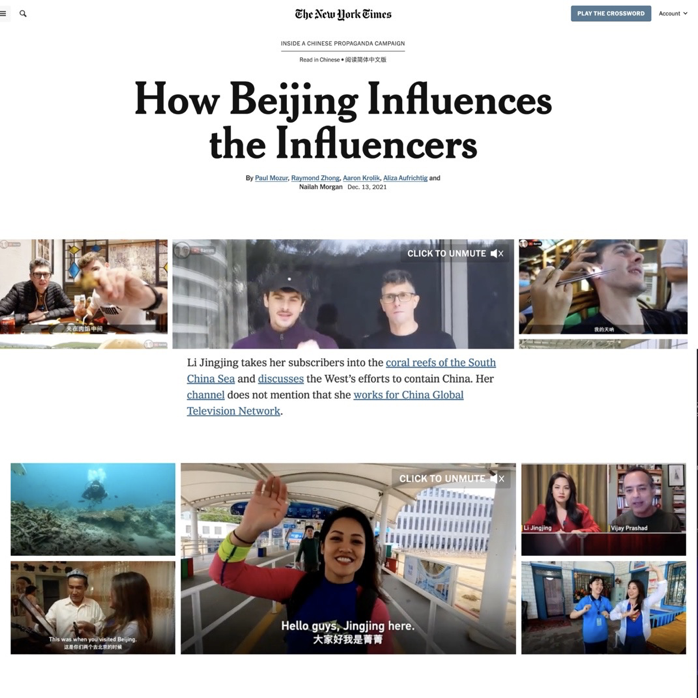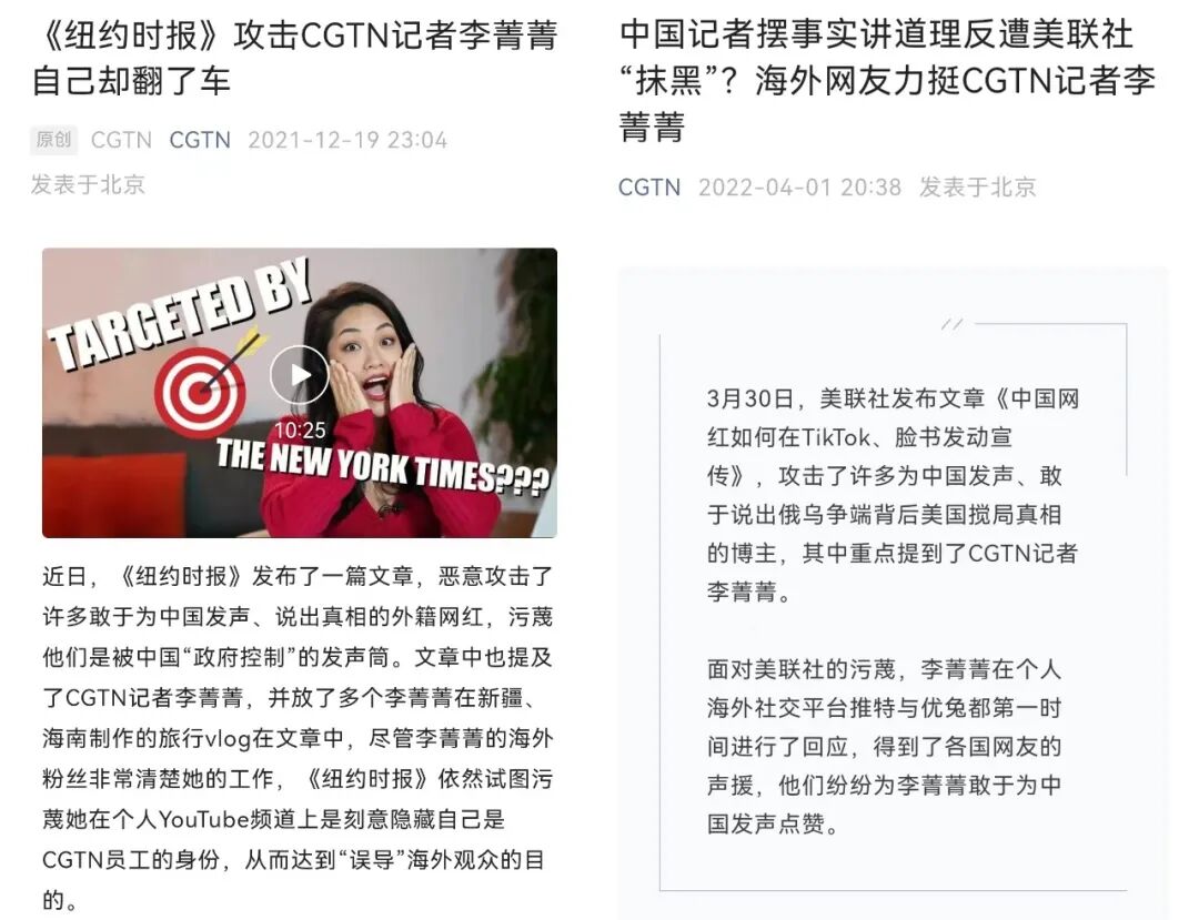 2021年底,《纽约时报》发布一篇文章,称多位外国博主是“被中国政府控制的发声筒”,李菁菁是唯一被点名的中国博主。文中配发多条李菁菁在新疆、海南制作的旅行vlog,试图污蔑她刻意隐藏自己是CGTN员工的身份。
