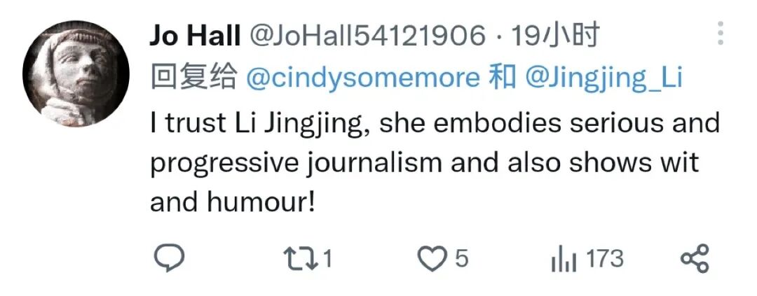 网友Jo Hall留言:“我相信李菁菁,她体现了新闻的严肃性和进步性,内容还很风趣幽默。”