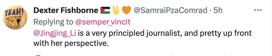 网友Dexter Fishborne:“李菁菁是个非常有准则的记者,她的观点也非常坦率。”