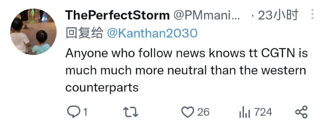 网友ThePerfectStorm:“任何关注新闻的人都知道CGTN的报道比西方媒体要中立很多。”