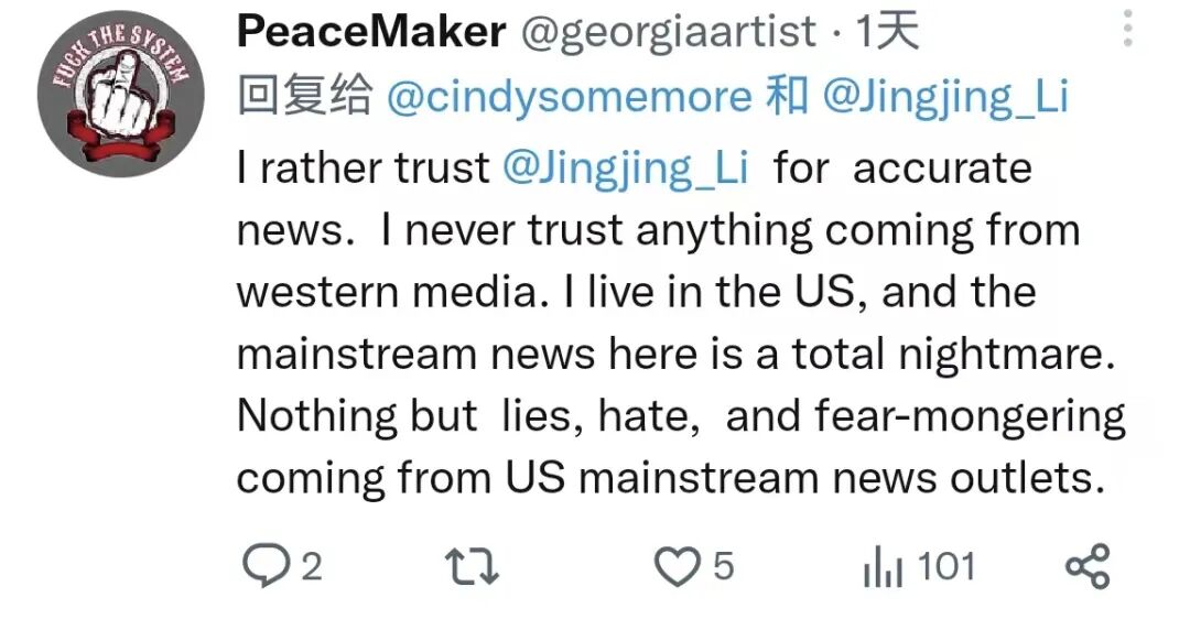网友PeaceMaker:“我更愿意选择相信李菁菁能做准确的报道。我从来不相信西方媒体的任何事情,我住在美国,但这里的媒体信息糟透了,全都是谎言、制造恐惧。”