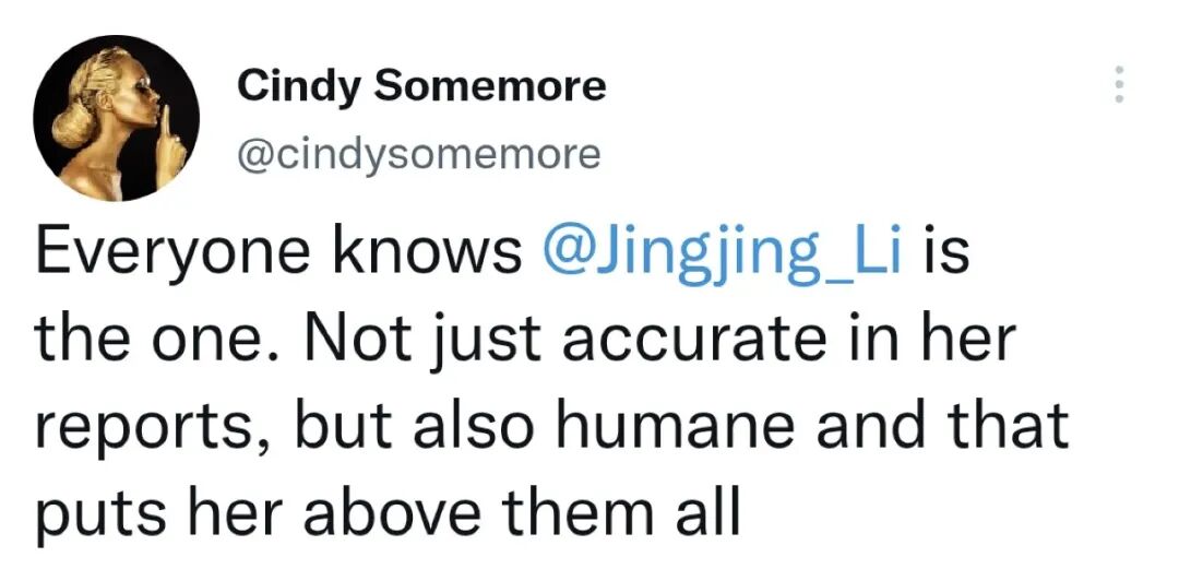 网友Cindy Somemore转发并评论:“所有人都知道,肯定是相信李菁菁。不仅因为她的报道都是准确的,她报道中的人性关怀让她远高于这些人。”