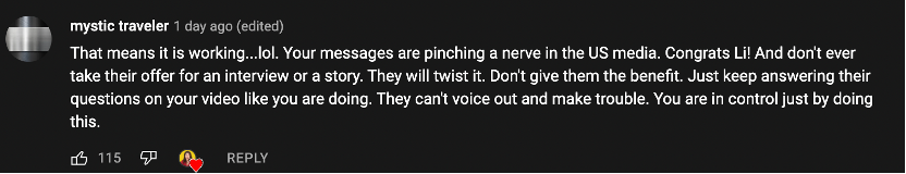 优兔网友mystic traveler说:“《纽约时报》对你的攻击说明你说出了真相,你传达的信息揭穿了美国媒体的谎言,祝贺你菁菁!不用花费工夫去接受他们的采访,因为他们会歪曲你所说的,不要让他们得逞。你可以就像现在这样,通过制作视频去回应他们,他们没法找你的麻烦,你做得非常好。”