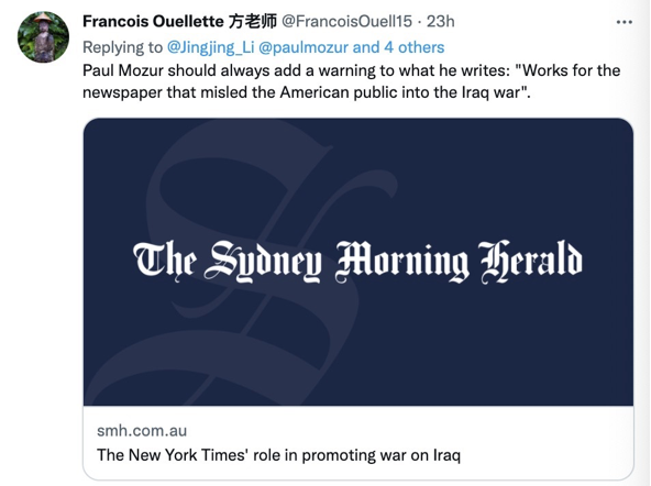 推特网友Francois Ouellette说:“Paul Mozur(《纽约时报》记者)在发表任何一篇文章前都应该首先说明:‘我为一家在伊拉克战争中误导全美国人民的新闻机构工作’。”
