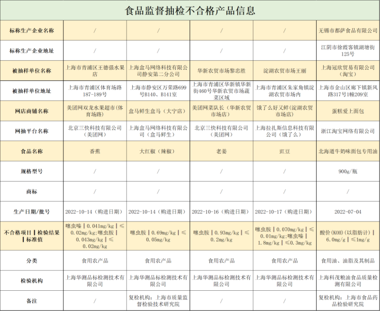 1.香蕉[销售商上海市青浦区王德强水果店;网店名称美团网双龙水果超市(体育场路)],不合格项目:噻虫嗪和噻虫胺;