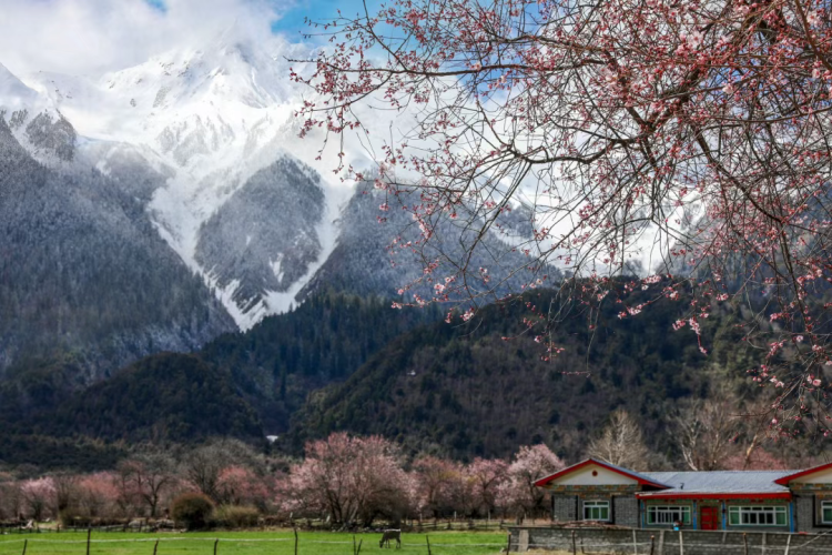 林芝地区的桃花是高原桃花,很多地方山脚桃花盛开,山上则是雪峰,可谓是“白里透红”……皑皑白雪更映衬着桃花的柔媚。