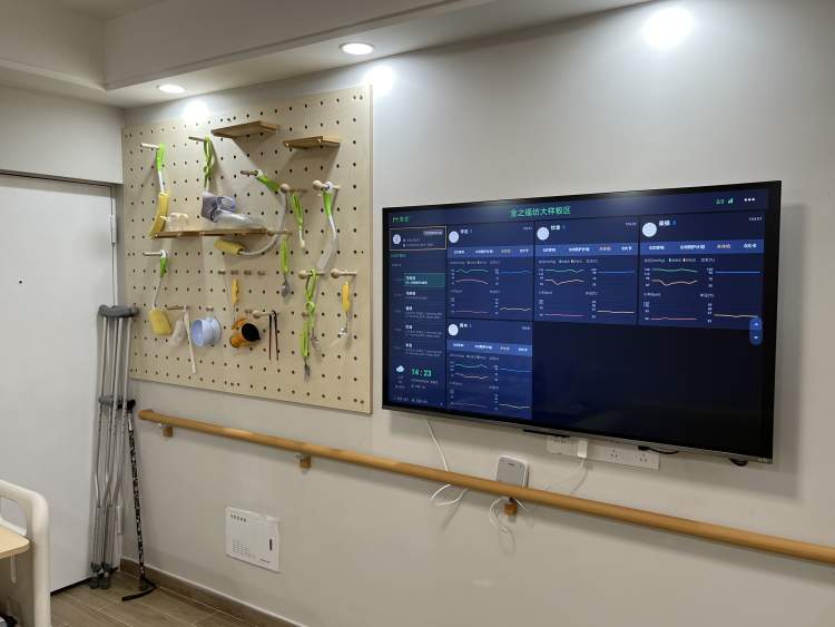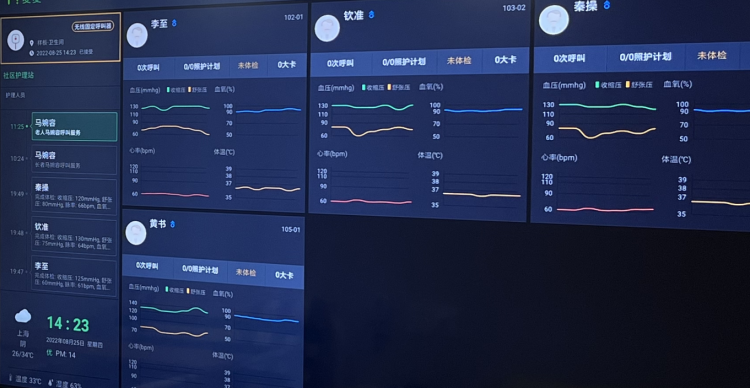 旁边的显示屏是依托长宁区智慧养老大数据平台打造的智能“养老顾问”,显示护理站的老人身体状况的一些信息,以及服务呼叫提醒等等。