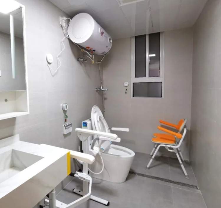 适老化改造过的卫生间,有可升降的如厕助力器、防滑坐浴椅……