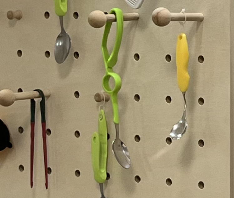 洞洞板上悬挂着的,就是适合老年人使用的梳子、勺子、牙刷……据介绍,老年人的身体机能与年轻人不同,有时候握筷子、握勺子拿不稳,因此有适老化设计的勺子有一个手指可以穿进去的环,可以起到固定作用。