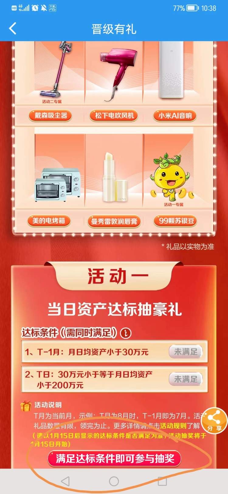 从胡先生截图的活动页面可知,江苏银行该活动从1月初持续到3月底。其中有一个活动项目叫“理财客户晋级礼”,“资产晋级达标,领取缤纷豪礼”。资产晋级达标30万元,可以抽取“当日资产达标礼”和“跨月资产达标礼”。奖品是吸尘器、电烤箱、吹风机、音响等。