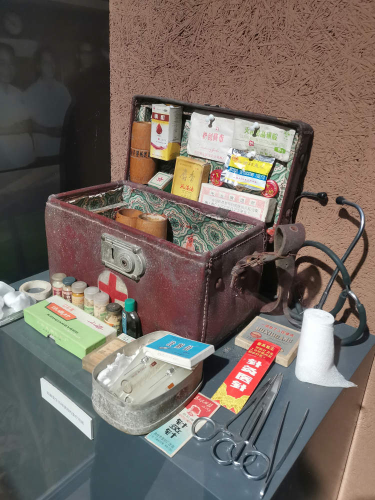 这只陈旧的棕红色药箱,箱体正面中间印有圆形白衬底的红十字图案,非常醒目。药箱旁摆放着常用的医疗用品,有听诊器、注射器、体温计、止血钳等;还有当年赤脚医生最常备的药品,有灭菌结晶磺胺、牛黄解毒片、阿司匹林、绿药膏、麝香风湿油、护创膏、碘酊等。