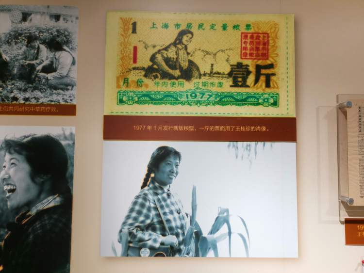 墙上的展示图片中,有一副放大的上海市居民定量粮票。王桂珍特意向记者介绍说,这张1977年发行的面额一斤的上海粮票,票面上的人物图案正是取自于她本人的肖像。
