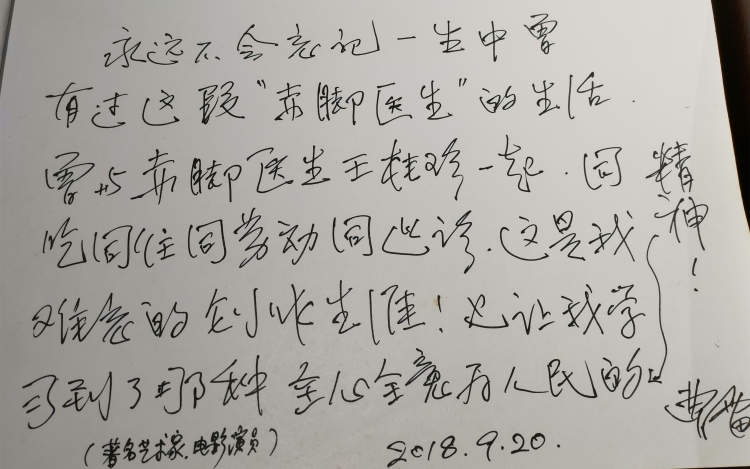 令王桂珍颇感意外与惊喜的是,赤脚医生陈列馆刚刚开放一周,著名艺术家曹雷就赶来了。当年,曹雷曾参与话剧《赤脚医生》的创作,体验生活时与王桂珍同吃同住,“永远不会忘记一生中曾有过这段‘赤脚医生’的生活,曾与赤脚医生王桂珍一起,同吃同住同劳动同巡诊,这是我难忘的创作生涯!也让我学习到了那种全心全意为人民服务的精神!”曹雷在留言簿上这样写道。