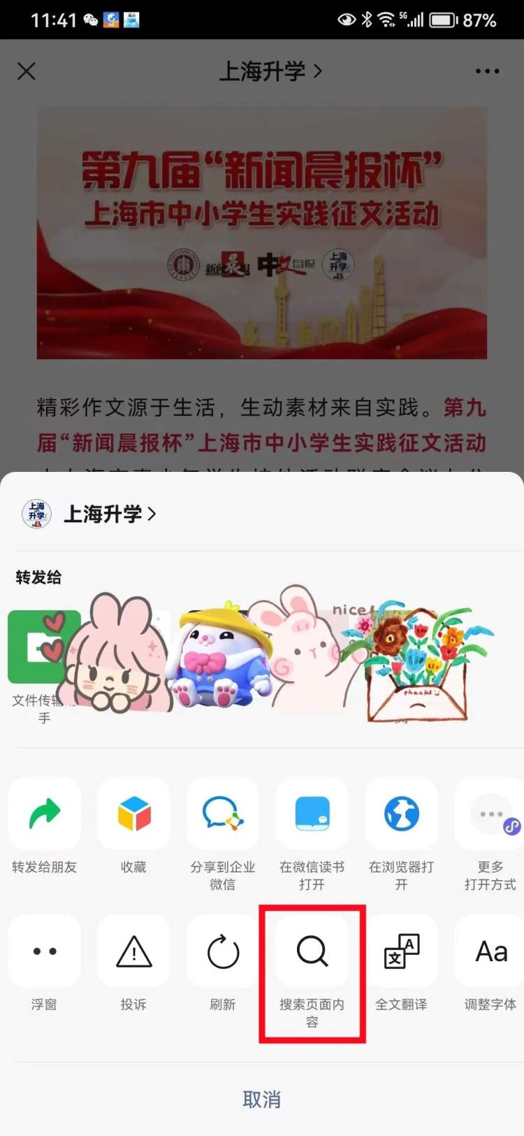 1.点击收到的入围名单页面右上角“…”处,在弹出页面中点击“搜索页面内容”。