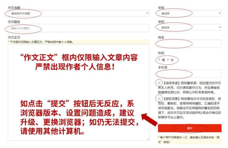 (2) 每人仅限提交一次征文,点击“提交”按钮相当于“交卷”!请务必确认页面信息一切正确后慎重操作,避免留下遗憾。