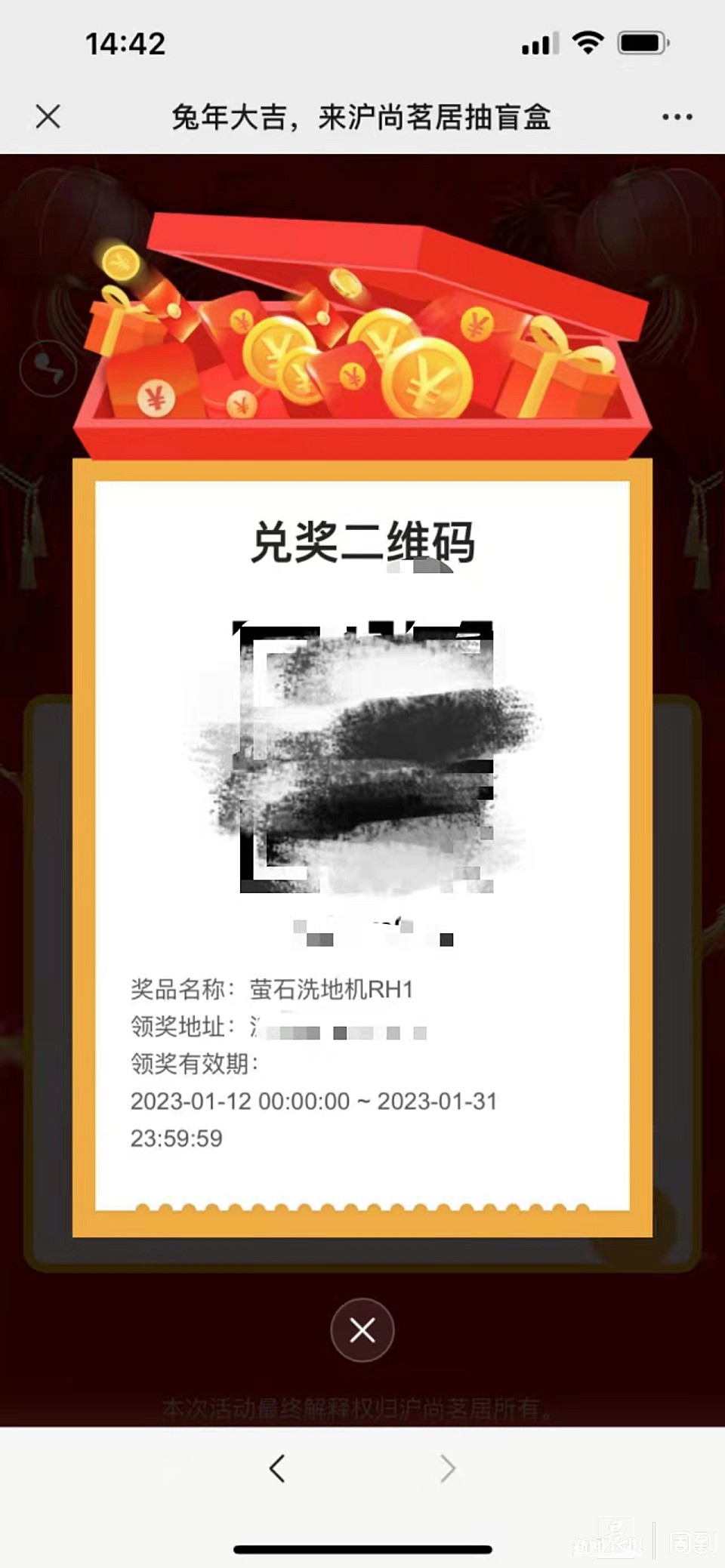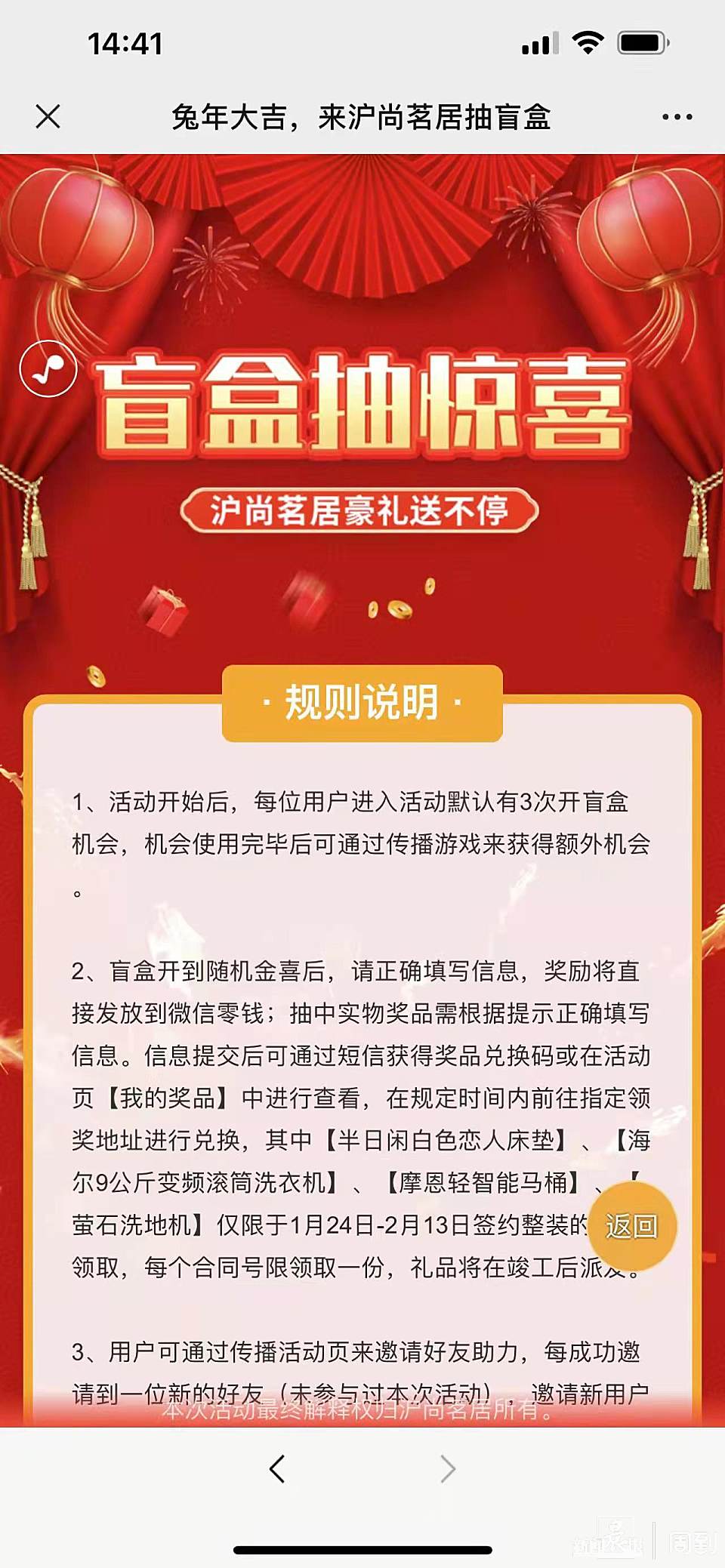1月21日,沪尚茗居在微信小程序内推出了“盲盒抽惊喜”活动,盲盒中的奖品不仅有红包、咖啡券、鸡蛋、大米等小礼品,还包含iPhone、洗地机、洗衣机等“大件礼品”。
