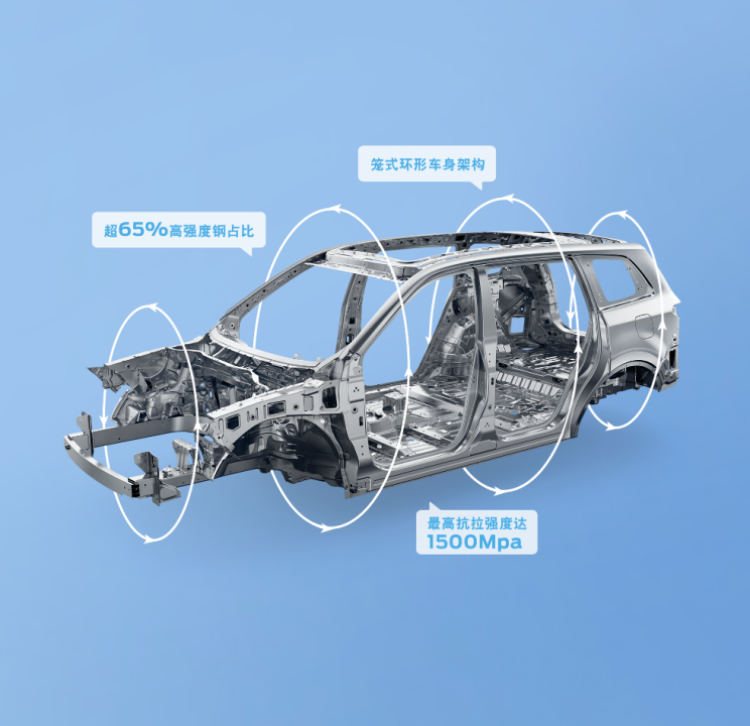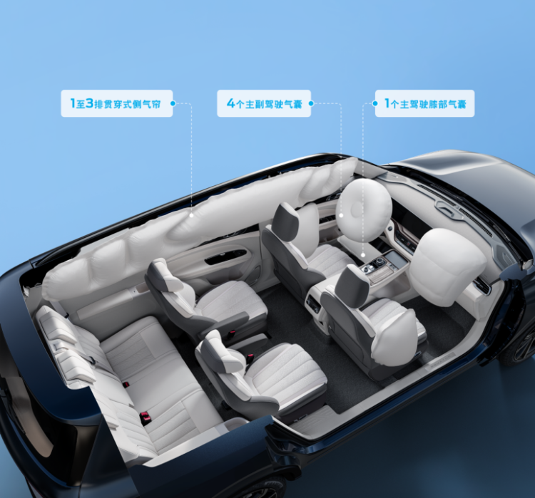 在被动安全方面,全车车身主要由多种高强度钢组成,占比高达65.4%。其中热成型硼钢强度高达1500Mpa,达到航空飞机起落架的强度级别。高强度车身可有效抵御各方向的直接撞击,最大程度减小车身结构变形。全系标配7个安全气囊。同级独有的主驾驶膝部气囊以及一至三排贯穿式侧气帘,最大程度保障车内人员安全。