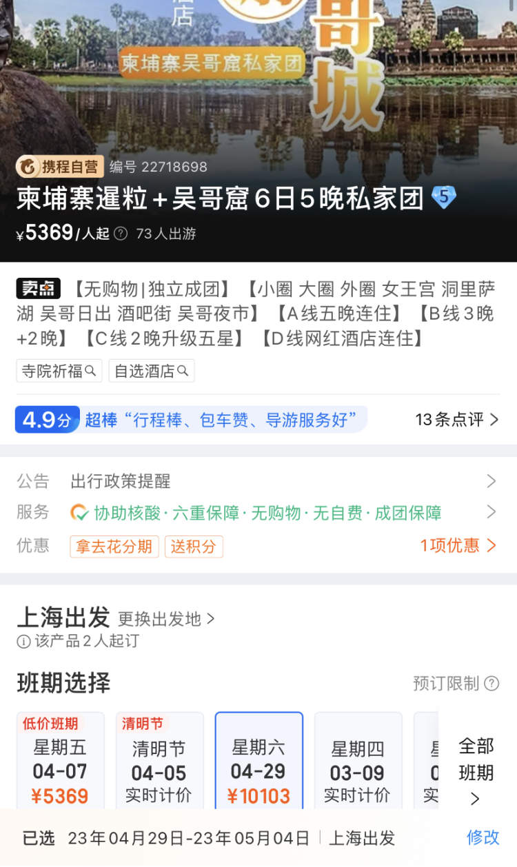 记者查询某旅行平台,以“柬埔寨暹粒+吴哥窟的6日5晚”跟团游为例,“五一”价格相较平日价格差不多翻倍,选择4月7日出发,每人5369元起,而选择4月29日出发,一下子涨到了10103元。