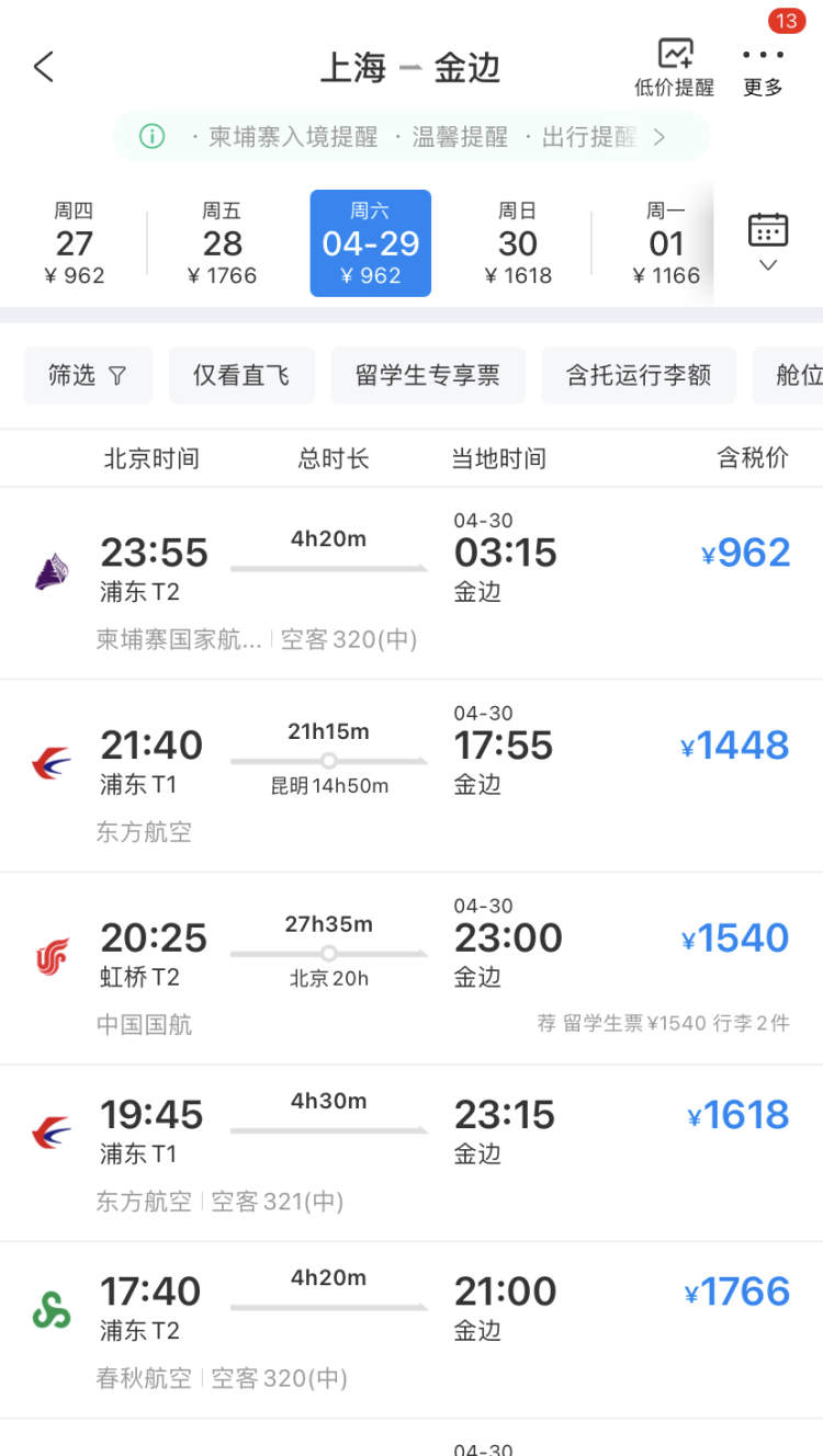 3月6日,记者搜索某旅行平台,选择4月29日从上海出发到金边,单程机票最低售价为962元,这个价格放在“五一”期间的确不贵,想自由行的建议提早预定。